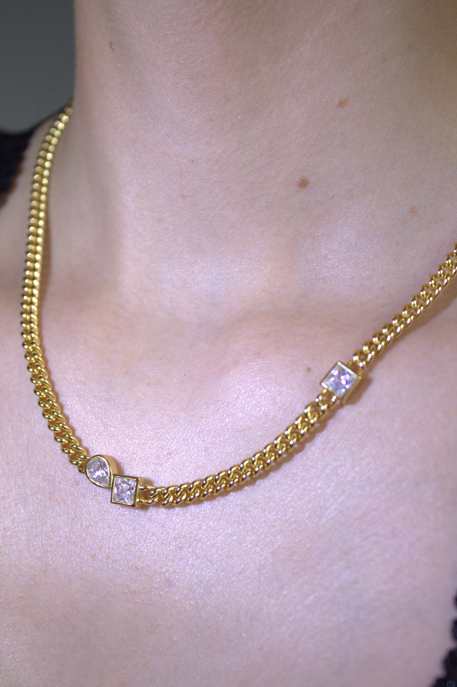 Bold yet refined — the Eleanor necklace is a statement piece with timeless charm. Crafted from a heavy curb chain, it’s adorned with two radiant princess-cut cubic zirconia stones, and one pear shaped, that catch the light beautifully.